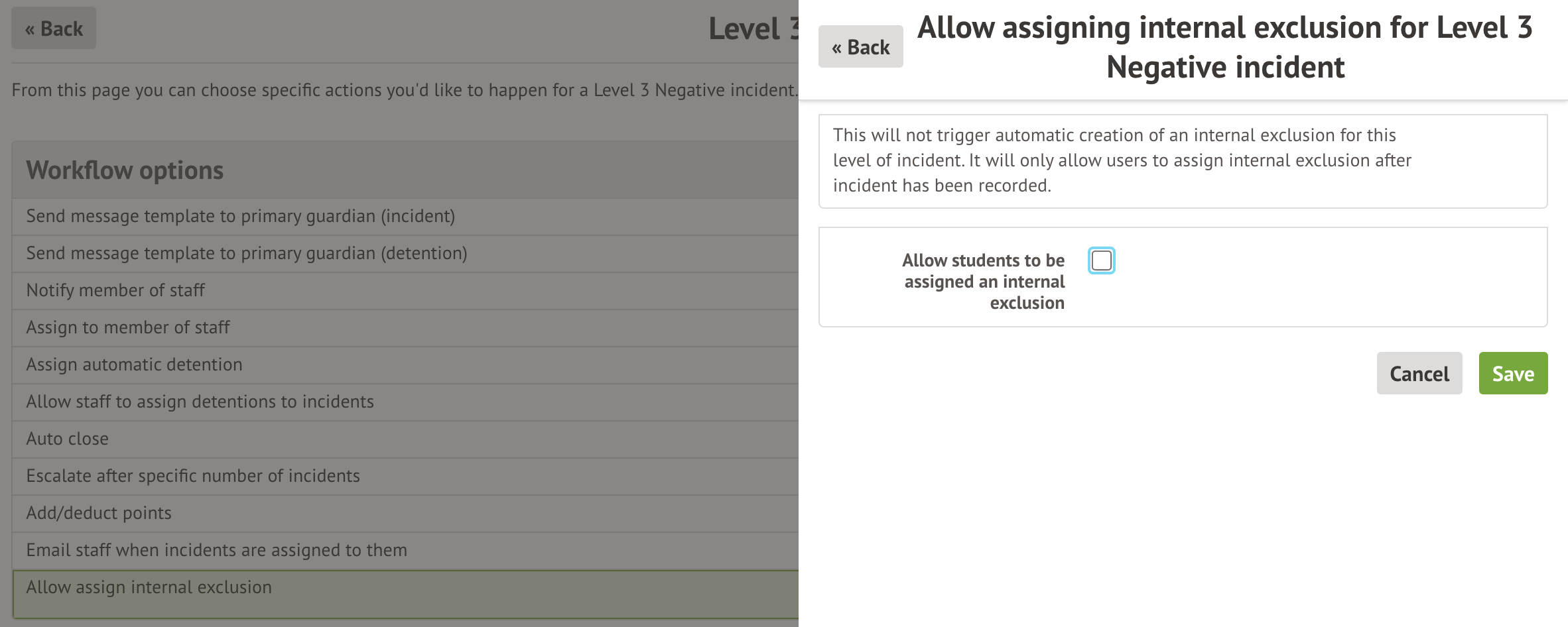 It is possible to ‘Allow students to be assigned an internal exclusion’ as part of your school’s behaviour workflows.