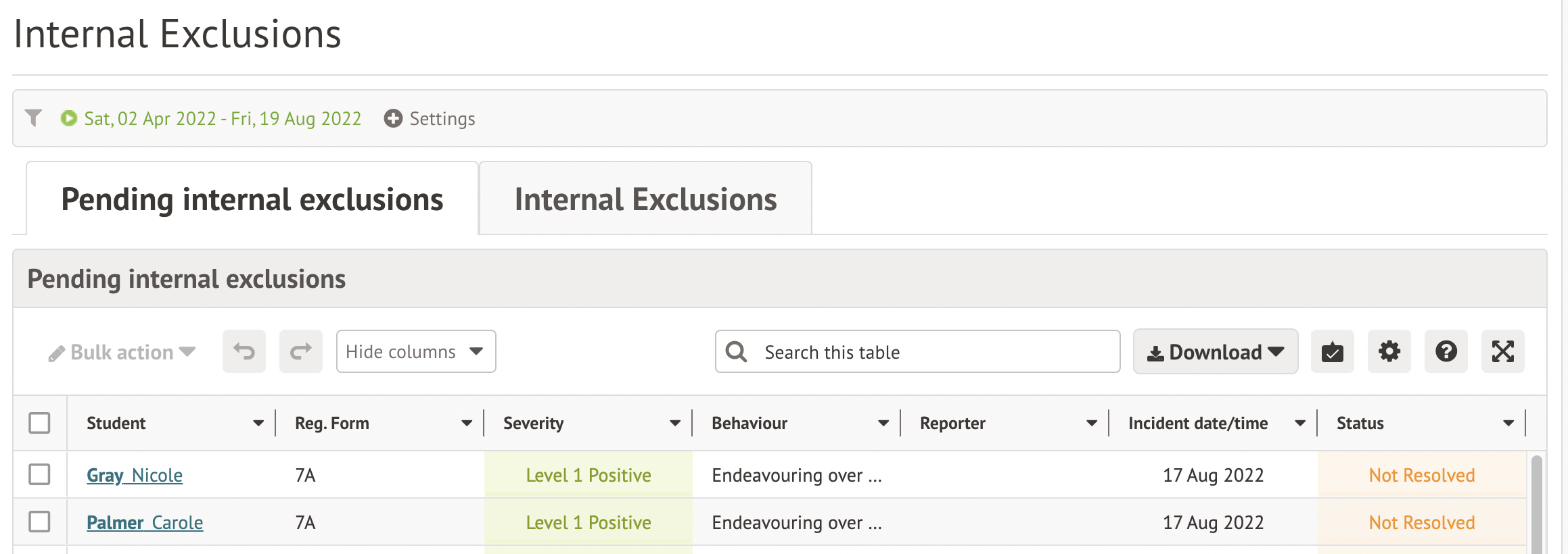 - Students will show in the Internal Exclusions tab if you select an internal exclusion as part of logging an incident, or if you add an internal exclusion manually without logging a behaviour incident.