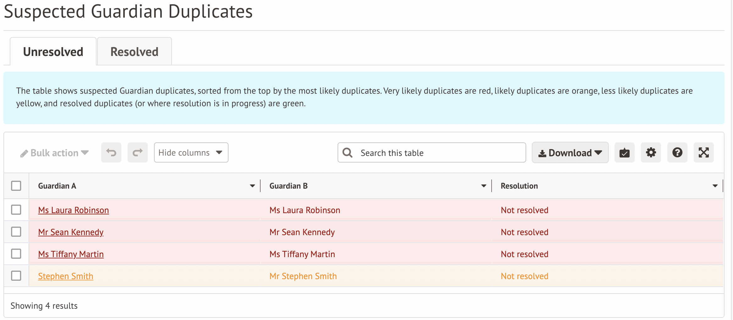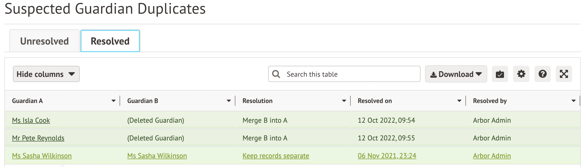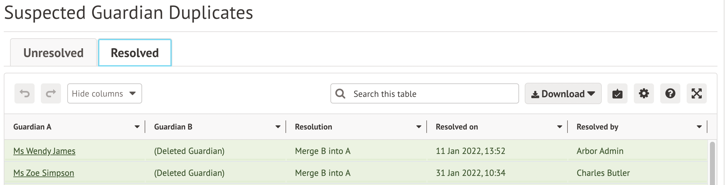 On the Suspected Duplicates page for guardians, you see Unresolved and Resolved duplicates in separate tabs.