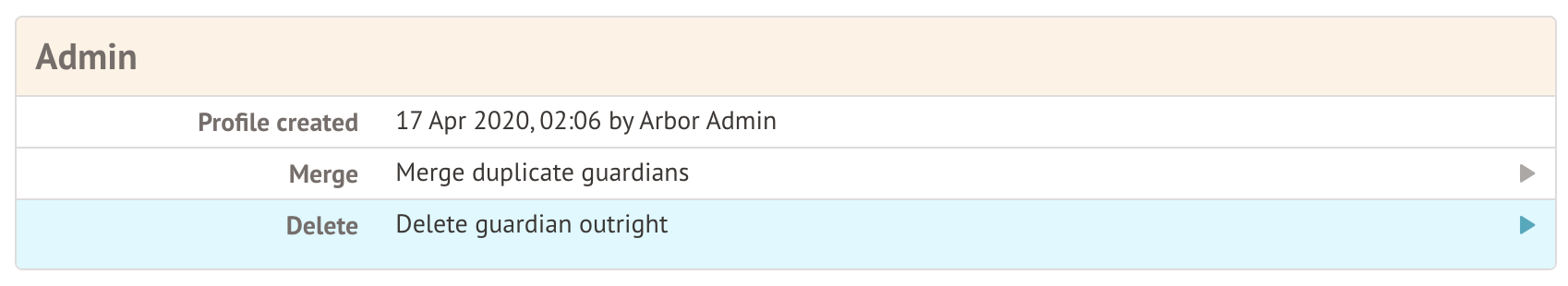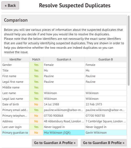 Please note: Arbor only checks whether a guardian potentially has two guardian profiles. If the guardian has a staff or student profile too, the system will not flag this as a duplicate profile.