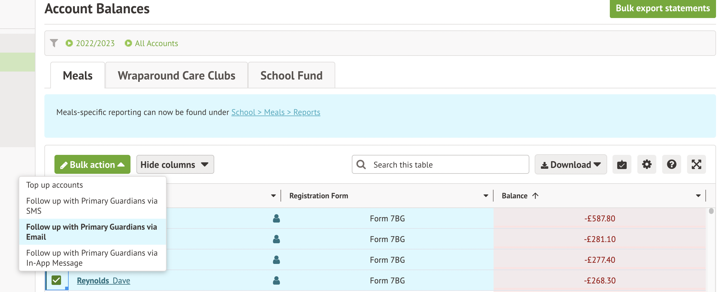 Using our built-in page in School > Payments > Accounts > Balances you can send a reminder to top up. Simply tick the boxes next to the students you want to follow up with, and use the green Bulk Action button to send a follow-up email, SMS or in-app message.follow up with balances.png