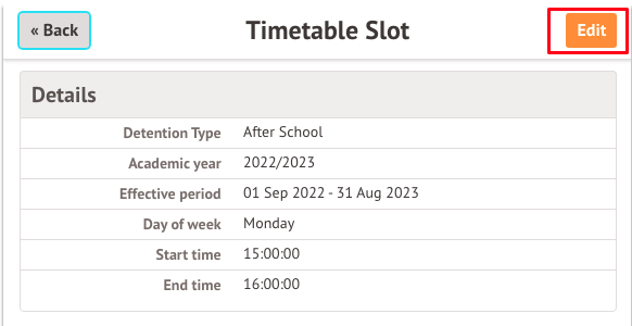 Click into one of the timetable slots and choose the Edit button from the slide over. It’s important to read the notice at the top of the slide over before you delete the slot.