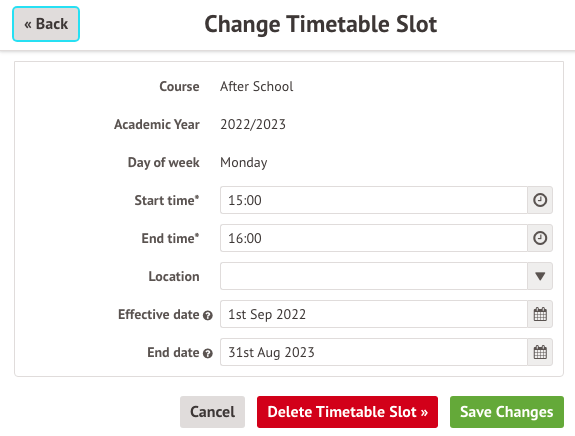 Once you are sure you need to delete the slot click Delete Timetable slot. Repeat this process until all the timetable slots are removed.