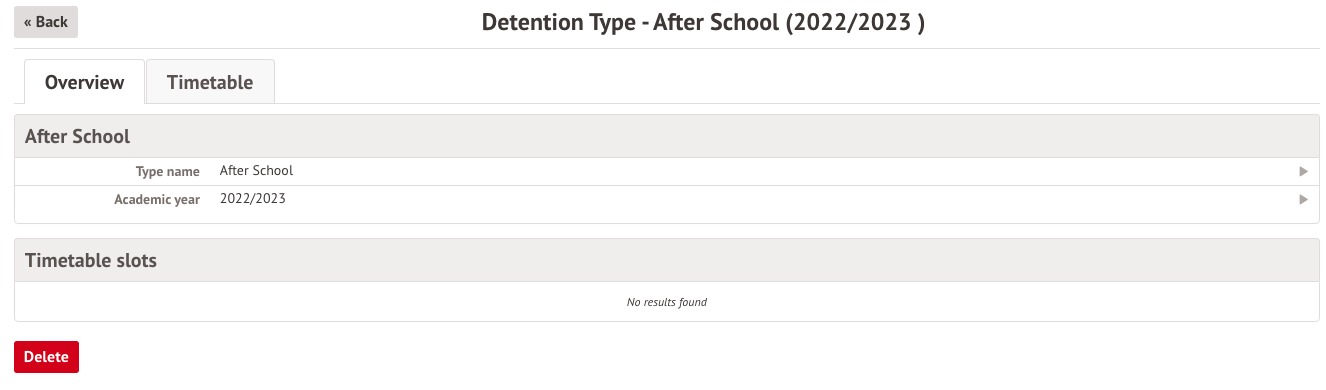 Once all the timetable slots are removed a red Delete button will appear on the detention type page. Click the Delete button to delete the detention type.