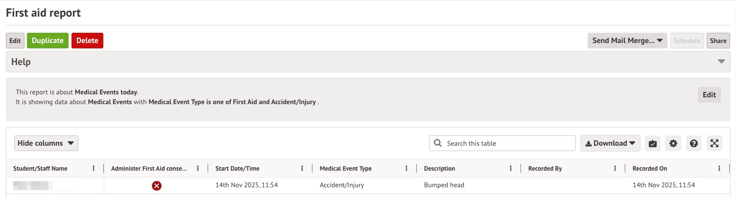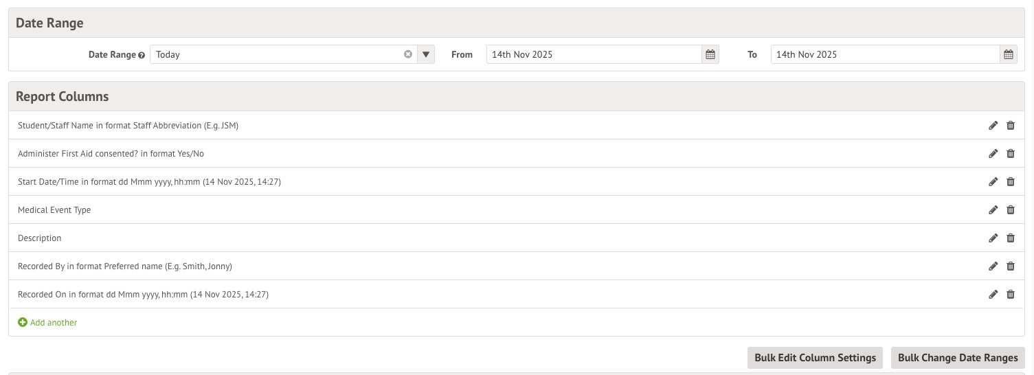 Note: We advise against adding columns for things like course leads or registration form tutors, as this can cause issues when loading this report for medical events surrounding a staff member rather than a student.
