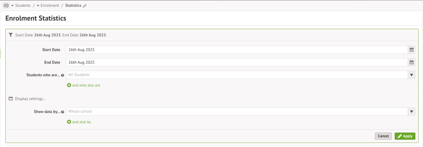 To see enrolment figures on a different date, across a date range or for a specific student group, we recommend using the Students > Enrolment > Statistics page to see your enrolment numbers in a table