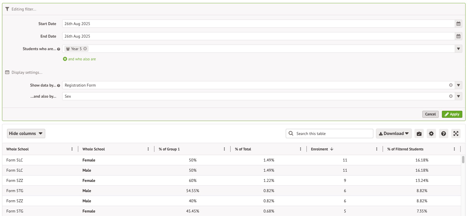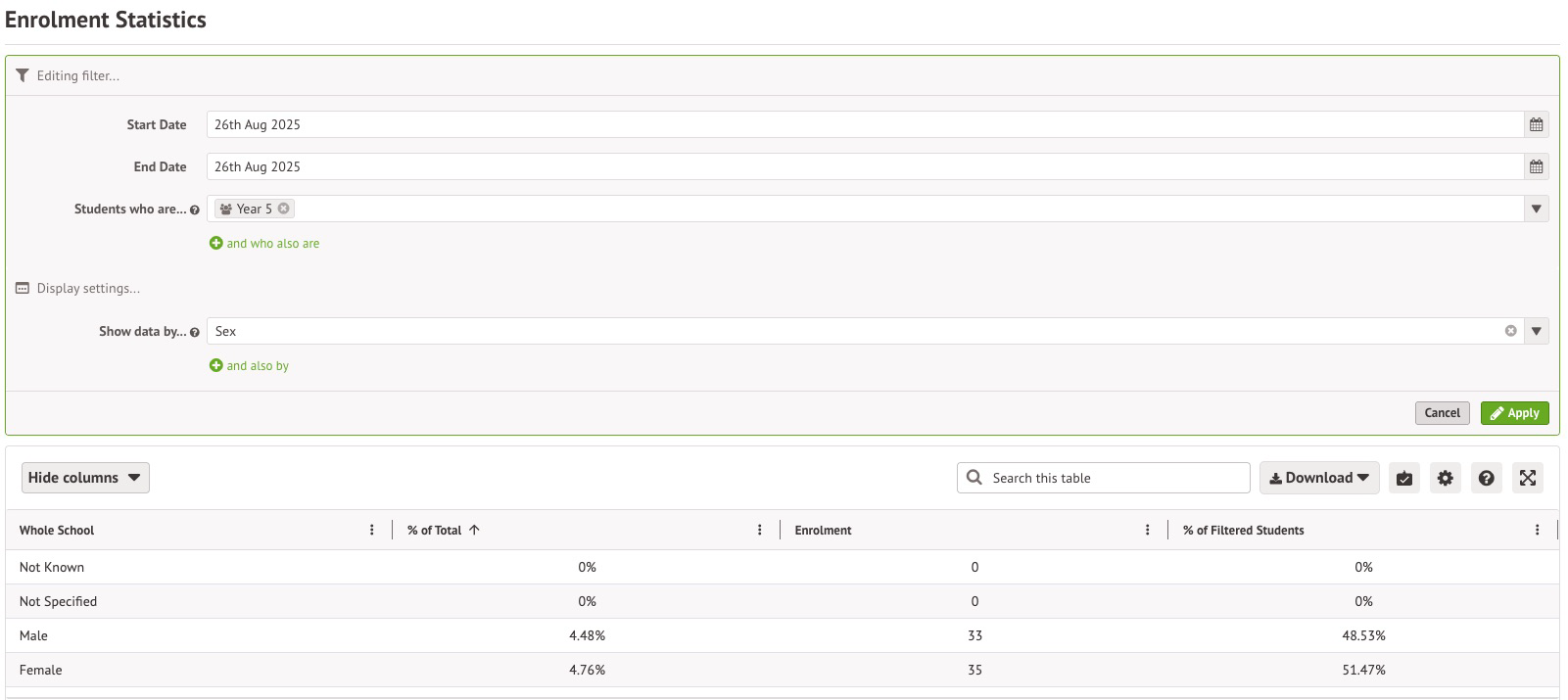 For example, if you want to view enrolment for Year 5 students, and then want to see how many of those students are male and female, you would use the Students who are... dropdown to narrow your students down to Year 5 only. Then, you would use Show data by... to group the table by Sex. In the resulting table, you then see a row for each sex, with the number of students in Year 5 who fall within each sex within your date range.