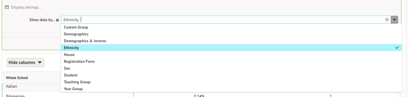 And also by... - use this to add a second grouping. For example, you might add a grouping by Registration Form and Sex to a table already filtered by Year 5 if you want to see the enrolment numbers male and female students by form groups in Year 5.
