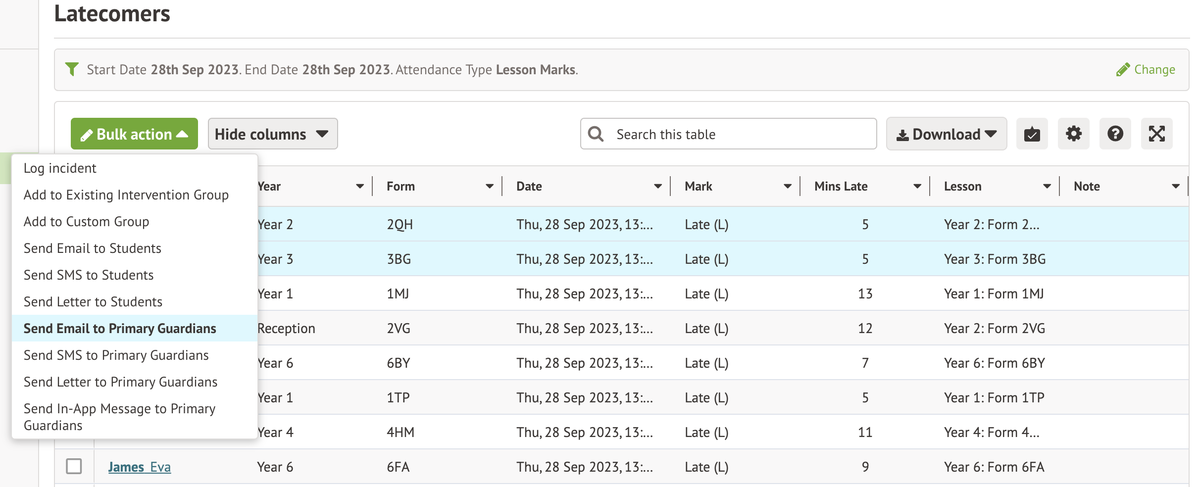 - Also anywhere where there are tick boxes next to names in tables, you can send communications. Just select the people to send the communications for, click the Bulk action button and select the communication type!