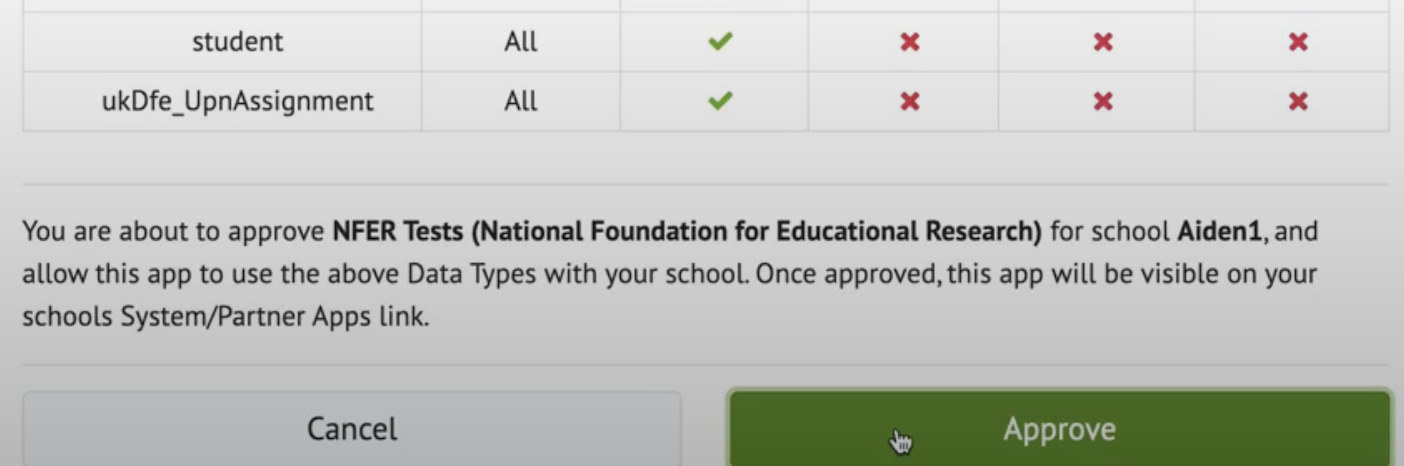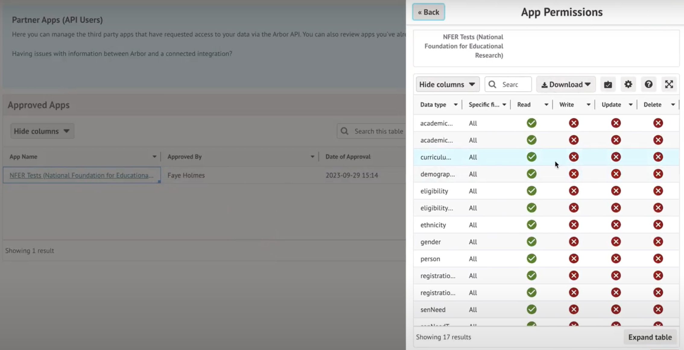 Once you have completed these instructions, you will be able to see the integration is live because it will be displayed in your Arbor MIS. Go to System > Partner Apps (API Users) > Approved Apps. The App will display as NFER Tests in this table.