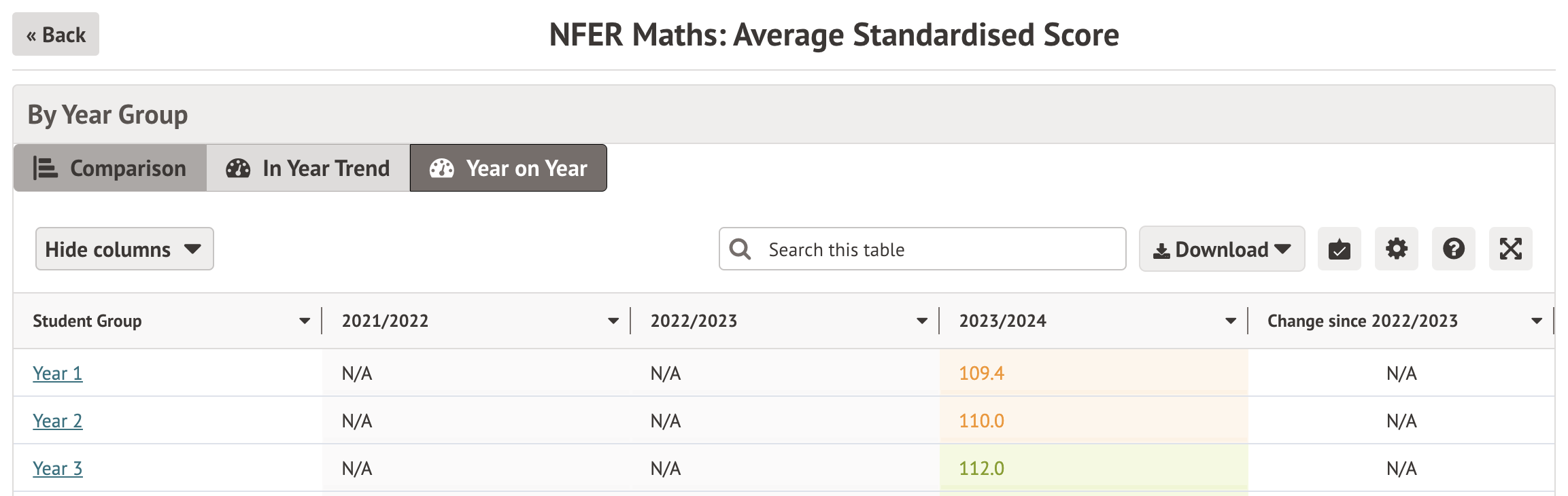 Please note that the In Year and Year on Year trend analysis use colour coding based on direct score comparisons, rather than indicating statistically significant differences between student groups.