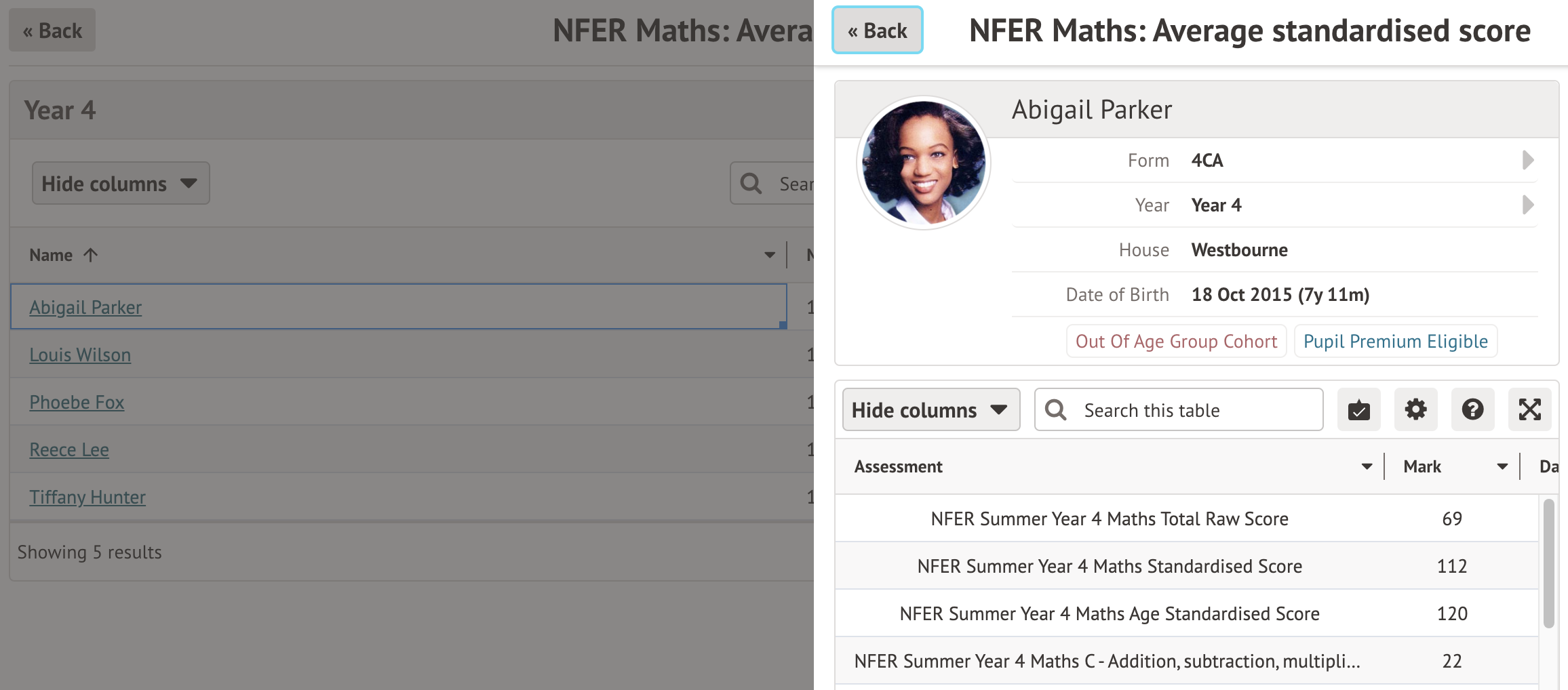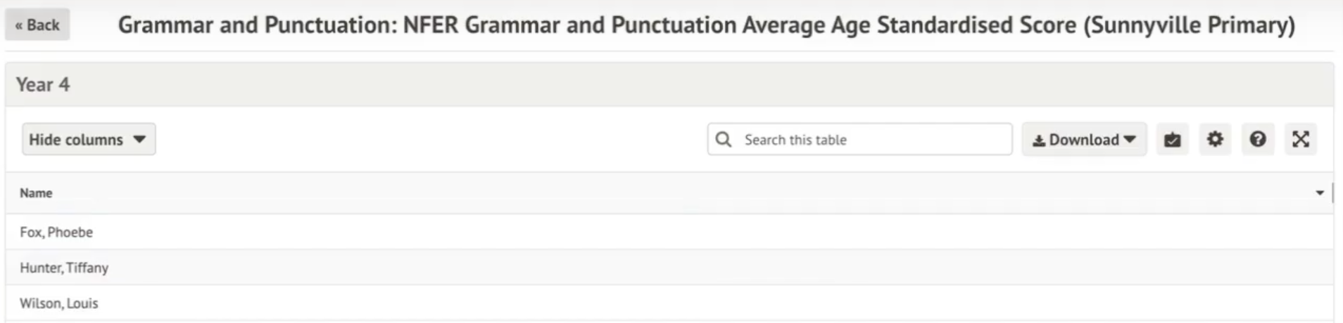 - Click a name to view individual student data - click their name again to jump to the Attainment section of their student profile.