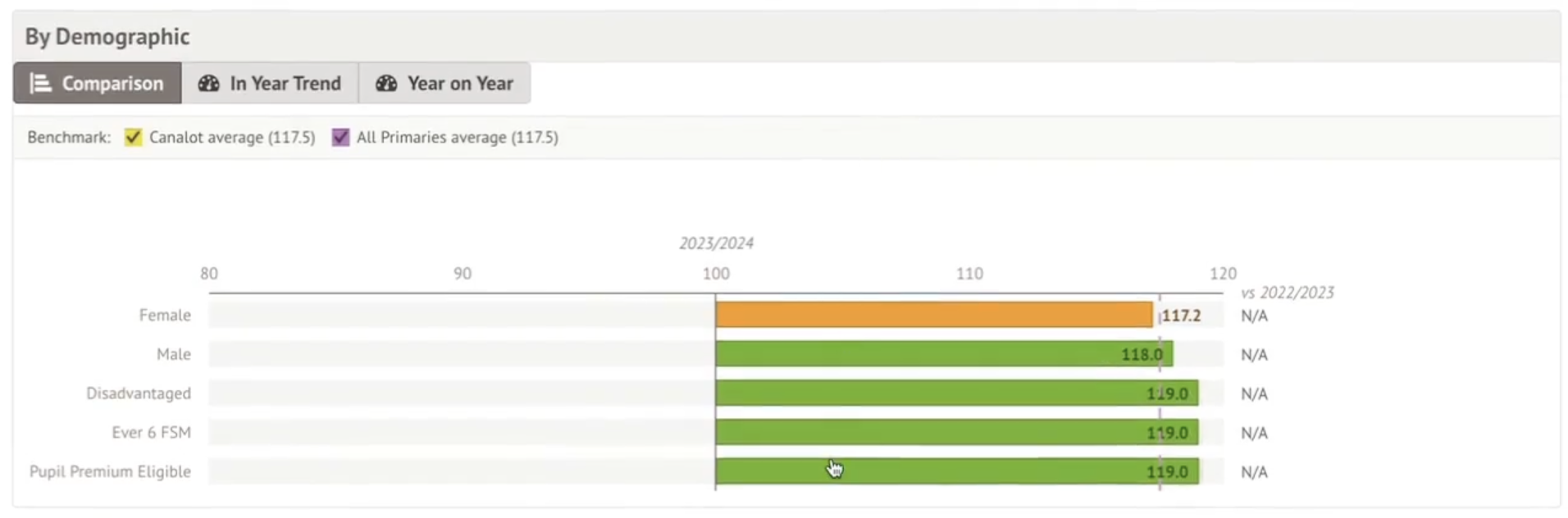 You can click one of the statistics to drill down to see averages for each Year Group, Demographic and Ethnicity.