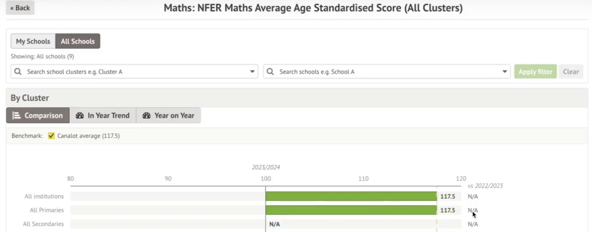 You can click one of the statistics to drill down to see averages for each School in the Cluster, Year Group, Demographic and Ethnicity.