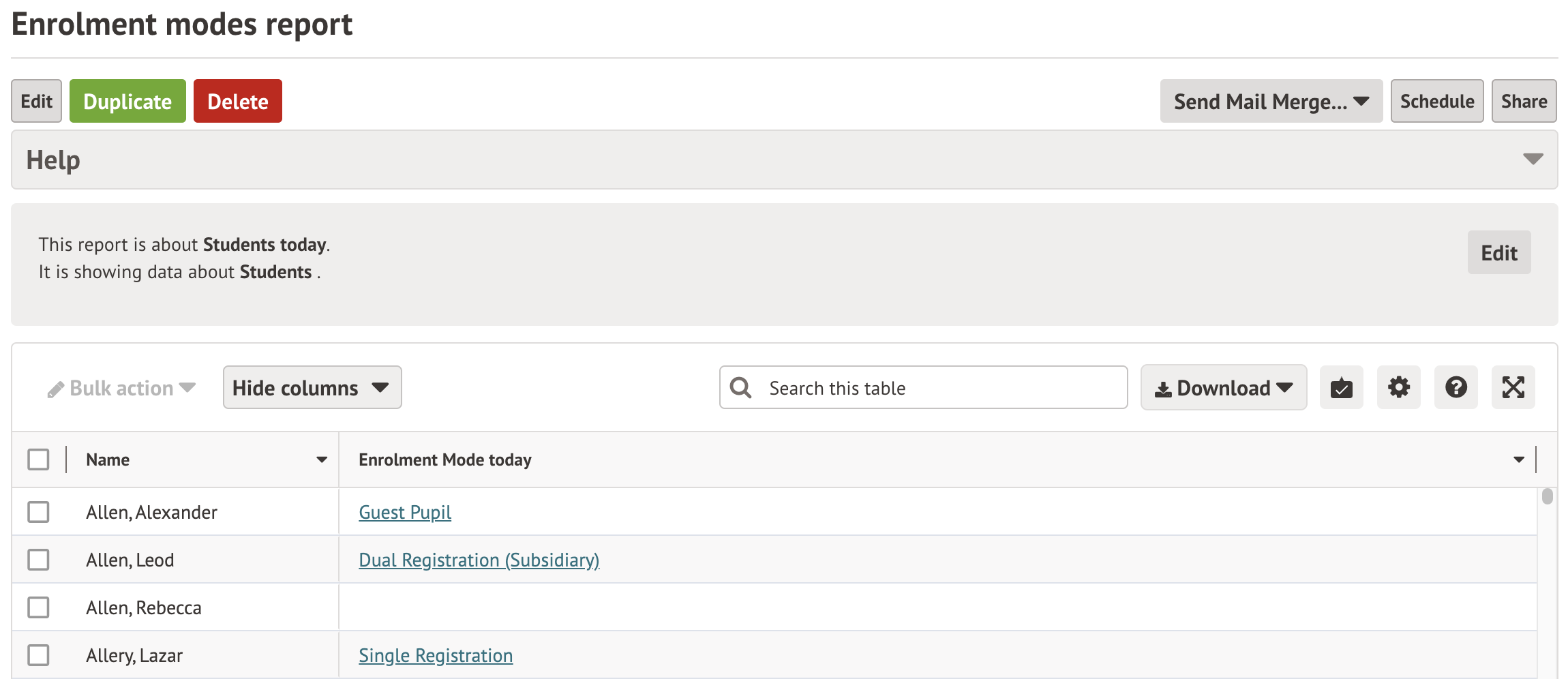 Top Tip: Students without an Enrolment Mode explicitly set will be assumed to be Single Registered for the census, but will show blank here.