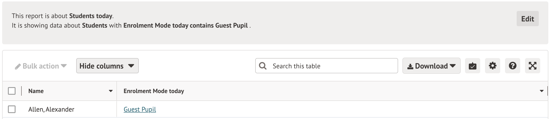 To see only students with a certain enrolment mode (such as Guest students), click to edit your report and add a filter.