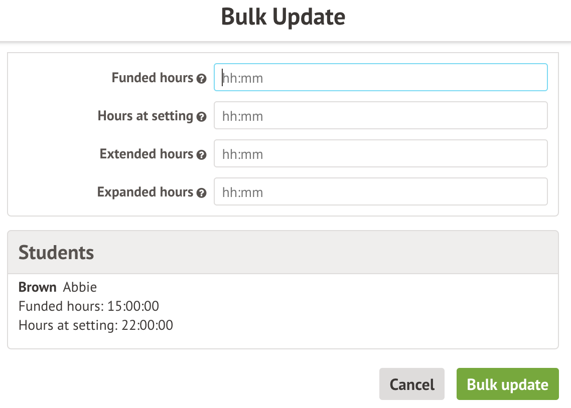 To fill in these details, go to Students > All Students > Bulk Update > Bulk Update Funded Hours.