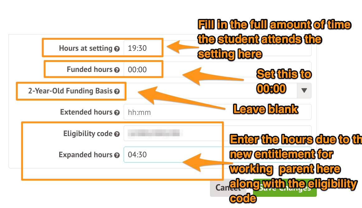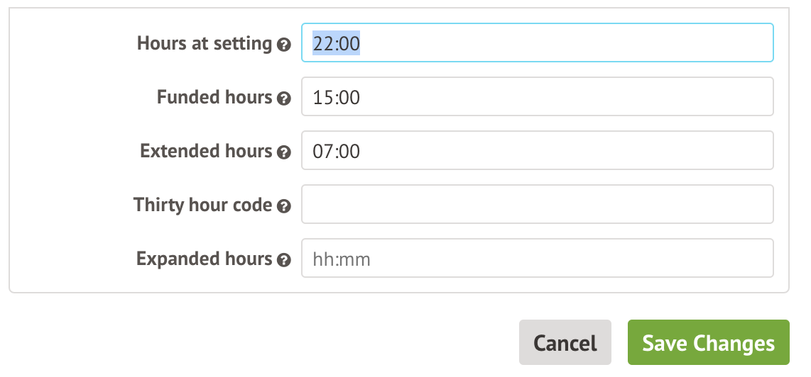 You can then update the Hours at setting, Funded hours, Extended hours, Expanded hours, Thirty hour code and Funding basis (if required), then click Save Changes.