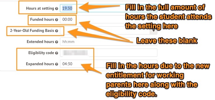 The below screenshot details how to fill in the fields for a student who has funded hours set for the new 2-year-old working parents entitlement: