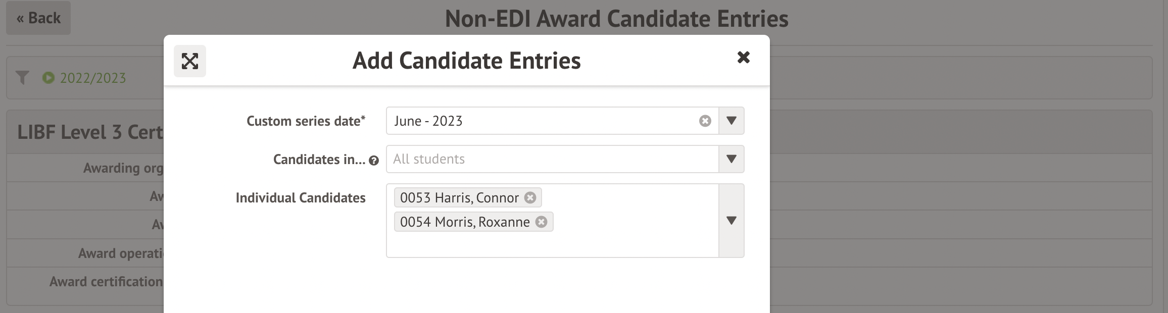 You must first enter students into awards and units. The process is very similar as for EDI qualifications, so please see our instructions here: Entering candidates in Arbor