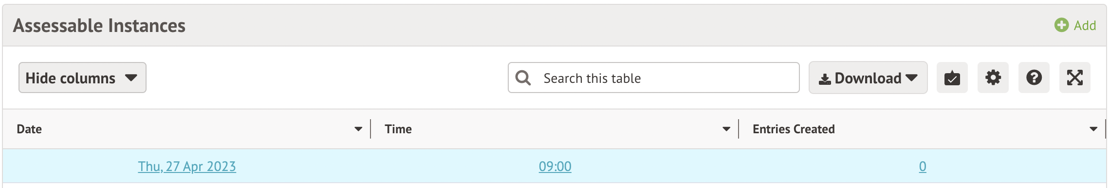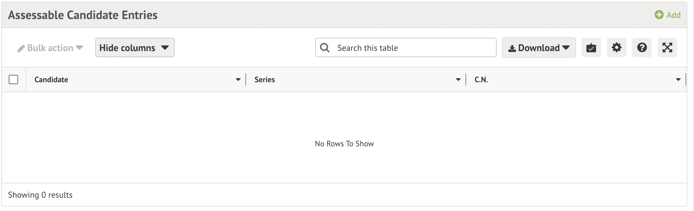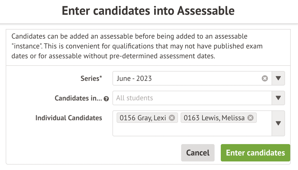 Click +Add in the Assessable Candidate Entries section to add students to assessables.