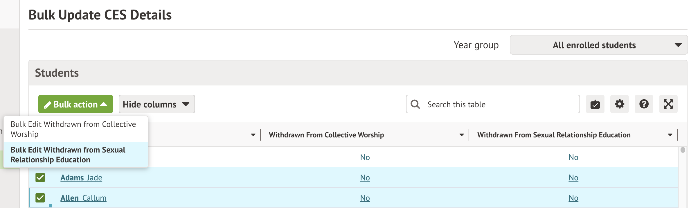Go to Students > All Students > Bulk Update > Bulk Update CES Details.