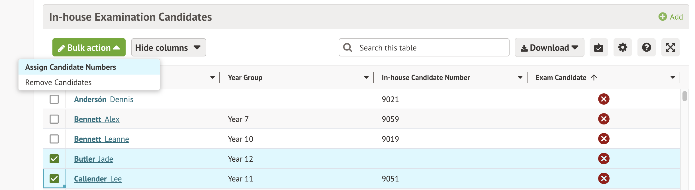 To assign a candidate number to a student who doesn't have one yet, tick the boxes next to the students. Click the Bulk action button to select Assign Candidate Numbers.