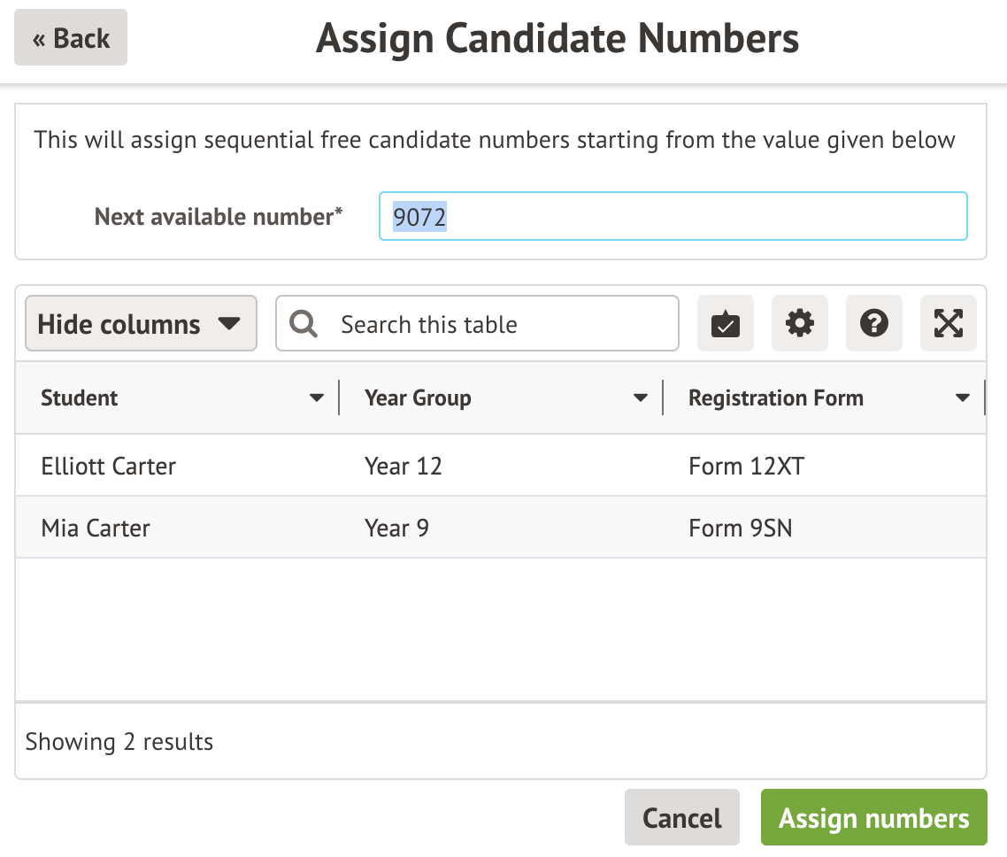 Choose the number to start assigning to the candidates from, and click Assign numbers.