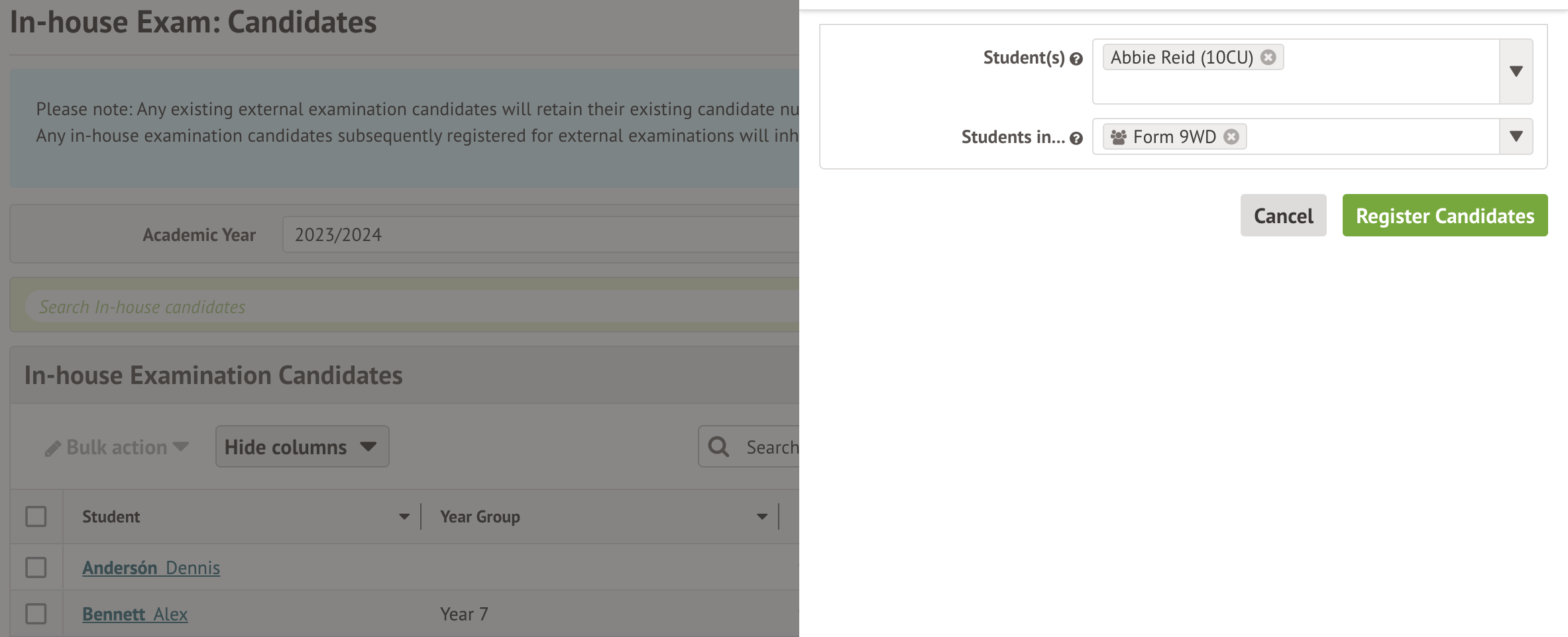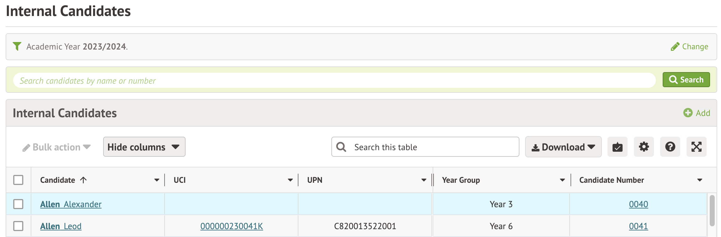 - If there is no lock, the In-house candidate number has been set and cannot be updated, apart from by assigning the student a candidate number for external exams.