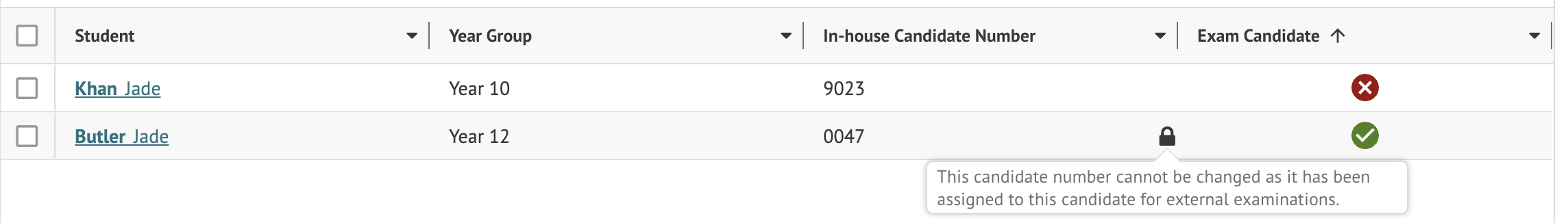 - If there is a lock, the number is set from the student's external exam candidate number and cannot be changed from here. To edit this, change their external candidate number.