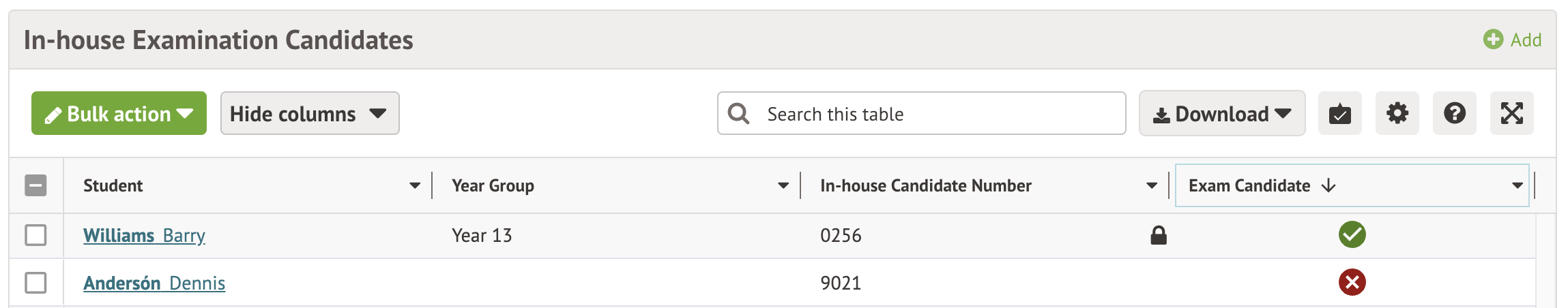 You can check whether students are external exam candidates using the ticks or crosses on the Students > In-House Exams > Candidates > Candidates page.