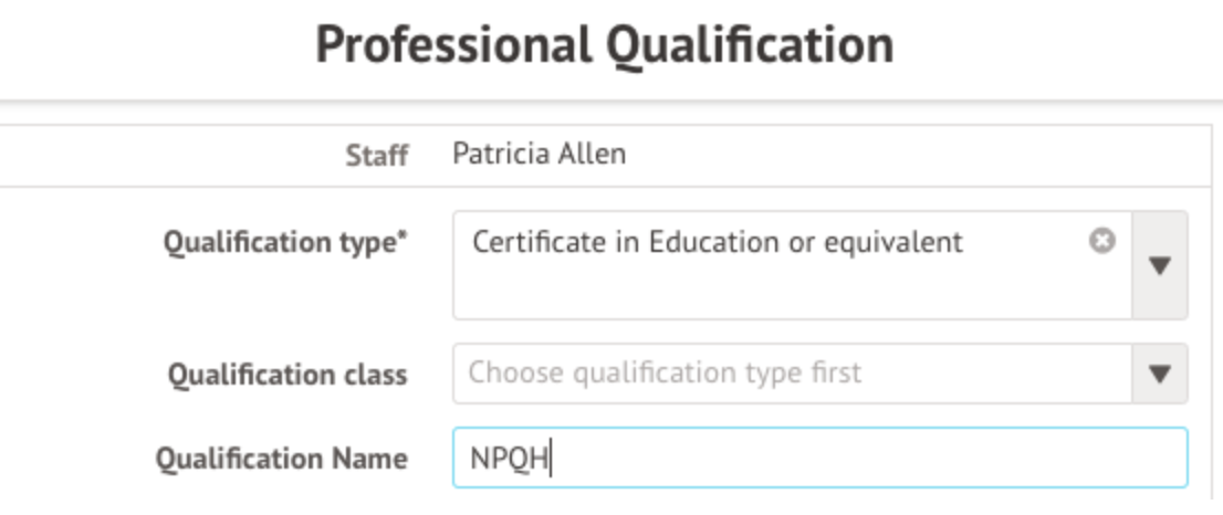 Add in the details, choosing 'Certificate in Education or Equivalent' for the type and 'NPQH' as the name, set a date awarded, and save.
