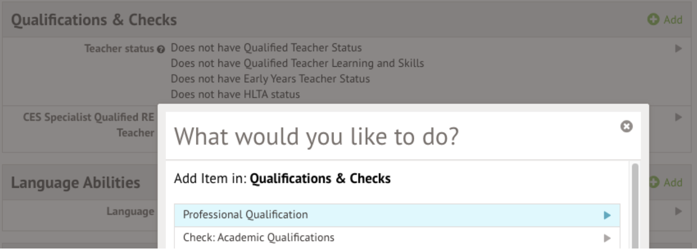 You will need to add a qualification to their profile from the Qualification & Checks section. Click +Add and choose to add a Professional Qualification.