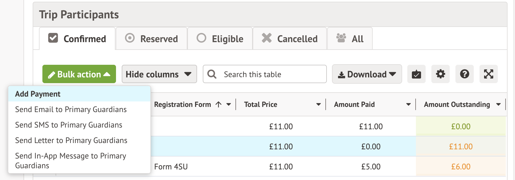 Alternatively, you can log payment manually. Go to the Confirmed tab, tick the box next to their name and click Add Payment.