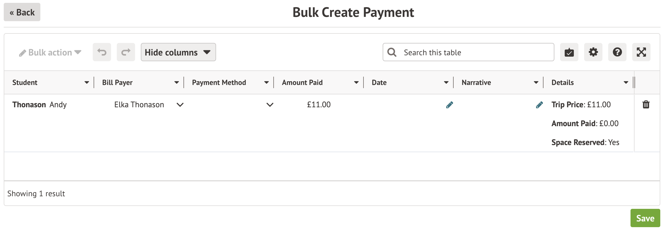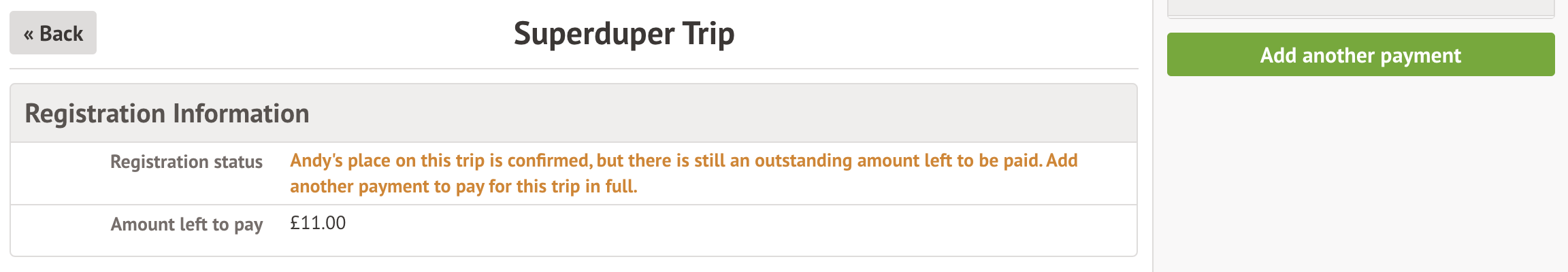 You can log cash, cheque or bank transfer, just in the same way as if you were manually signing a student up for a trip for the first time.
