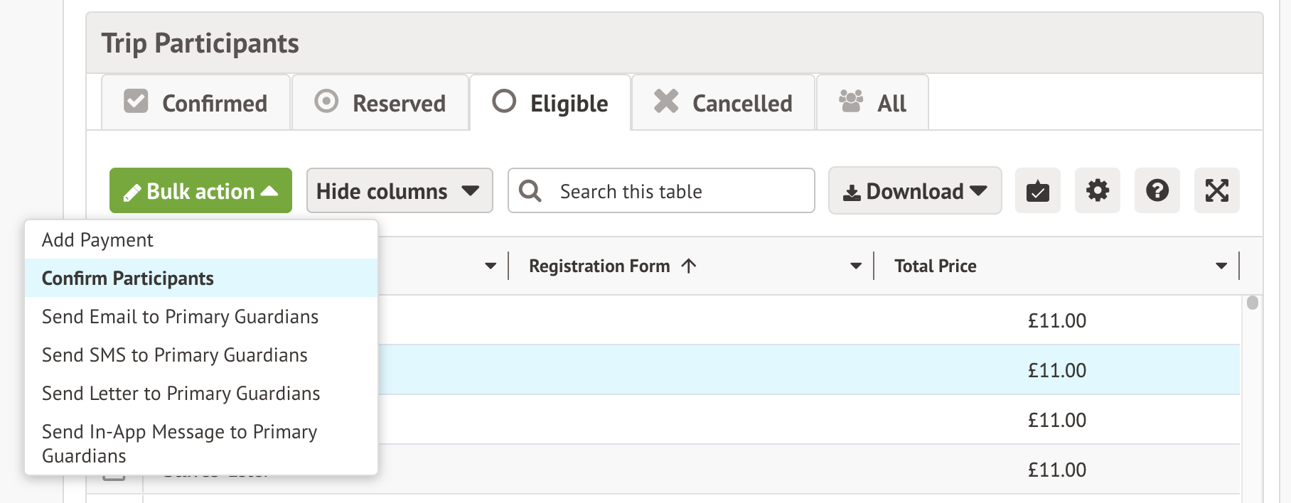 Find the student in the Eligible tab, tick the box next to their name and click Confirm Participants.