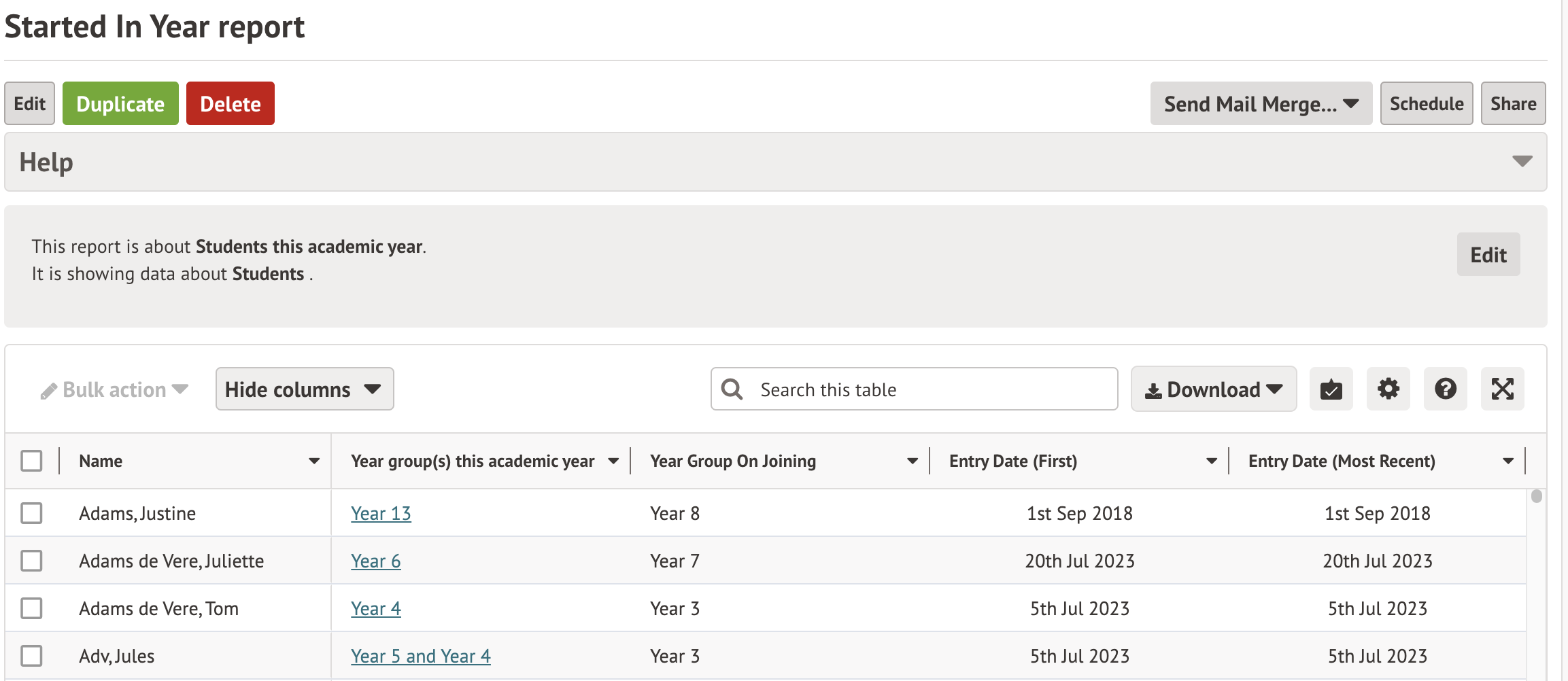 If you've already taken a look at our built-in birthday reporting but want to add more detail, you can use our report template to students' current year group, and the year group they joined the school in.