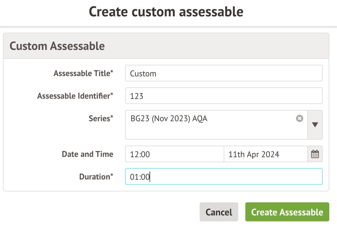 In the slide over, add a name, an identifier for your records and what series the assessable should be linked to. Add a date, time and duration (hours and minutes) then click Create Assessable.