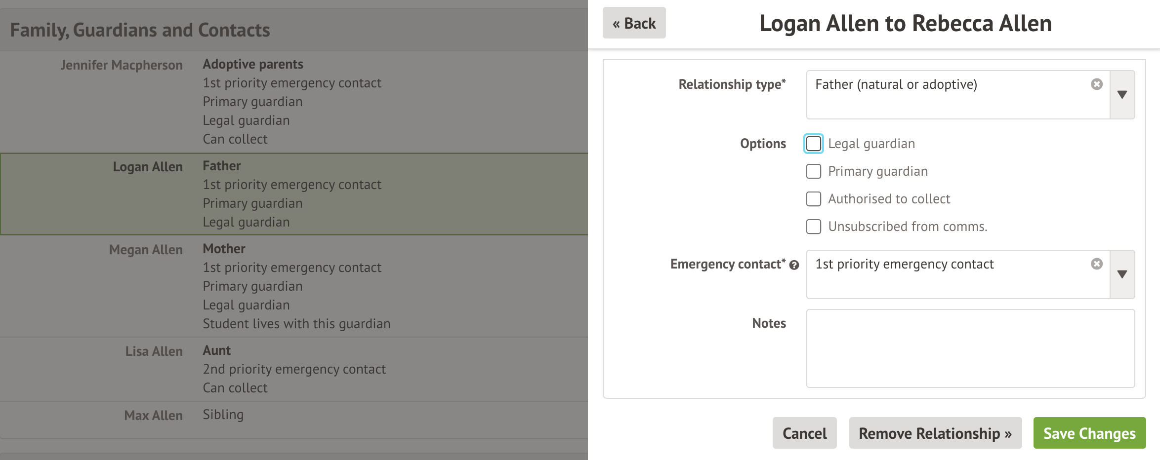 - For the old guardian, keep the relationship but untick the Legal guardian and Primary guardian boxes to show they have no responsibility. Top tip: This will not show that they previously had these responsibilities.