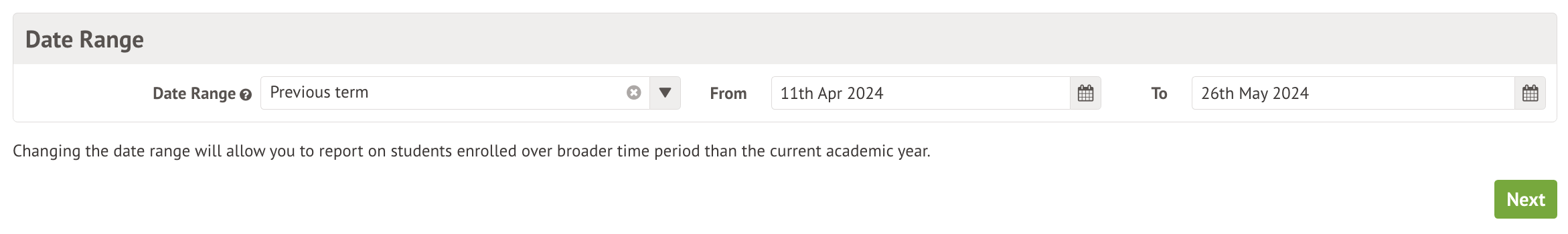 Next, select your date range. This will determine which students will be pulled into your report. In the example below, the report generated is for the previous term, and so will only look at students on roll last term, but you can set it to report on the last year, term, week, day, or a custom date range.