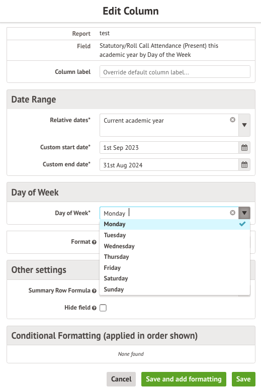 When adding the Statutory/Roll Call (Present) by Day of the week column, you can choose to change the name of the column or edit the display details. Make sure to set the date range to the time period you want to report on. You can also use the Statutory/Roll Call Attendance (Auth. Absent) by Day of the week, Statutory/Roll Call Attendance (Unauth. Absent) by Day of the week, and the Statutory/Roll Call Attendance (Absent) by Day of the week columns which have the same functionality.