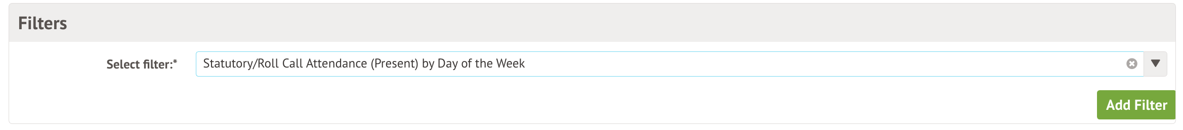 You can search in the select filter box and select Statutory/Roll Call Attendance (Present) by Day of the week, or any of the other Day of the week filters, then click Add Filter.