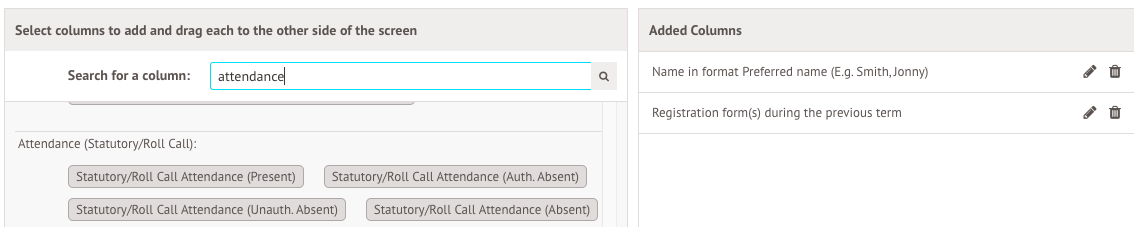 The next step is to add all the columns to your report that you need. In this example, a column for the students' names and their registration forms have been added.