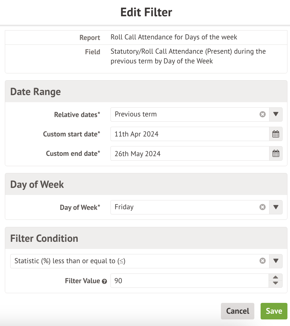 In the slide over, change the filter condition to your preferred option, then click Save. In the example below, the filter condition is set to search for attendance equal to or less than 90% on Fridays for the previous term.