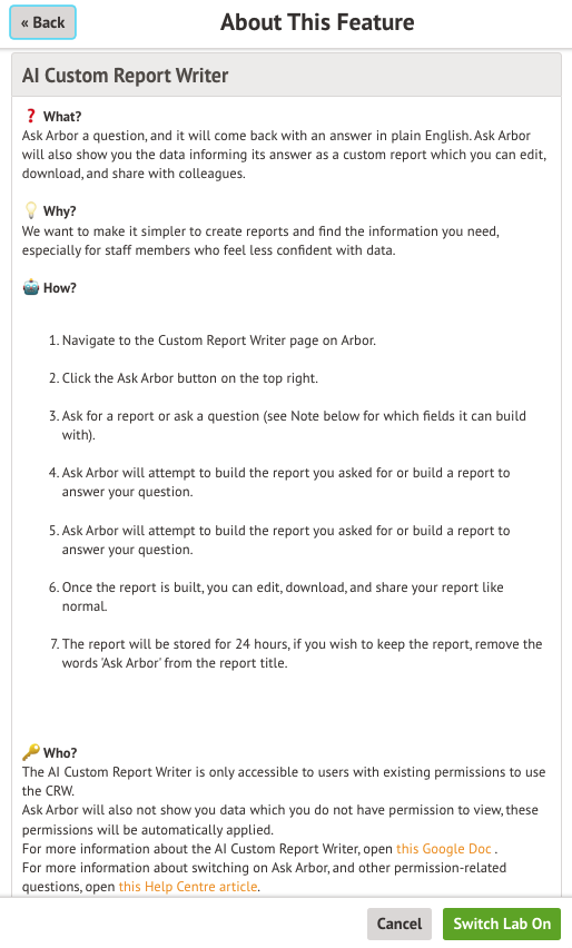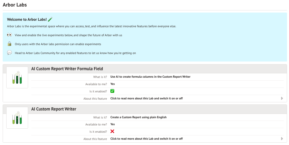 All features in Arbor Labs are in experimental mode; some will become full features in Arbor MIS, some will change following your feedback, and some will be retired. Once you’ve enabled a feature in Arbor Labs, head over to one of the Arbor Lab spaces in the Arbor HQ Community to let us know how you're getting on.
