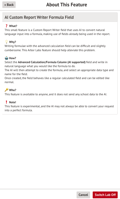 If you no longer want to take part in the test and wish to turn off a feature, you just need to click on the About this feature button for the field in question in the Arbor Labs page and click the red Switch Lab Off button.