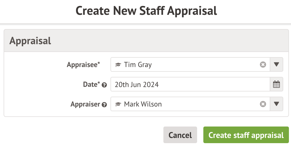 please note that appraisals can only be added for individually-selected staff members, or for every staff member if the Staff box is left blank.