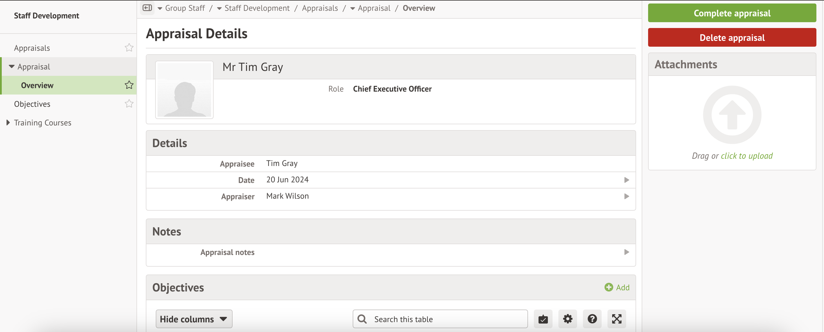 Once you click Create Staff Appraisal, you will be taken to the Appraisal Details page, which has sections for objectives and training.