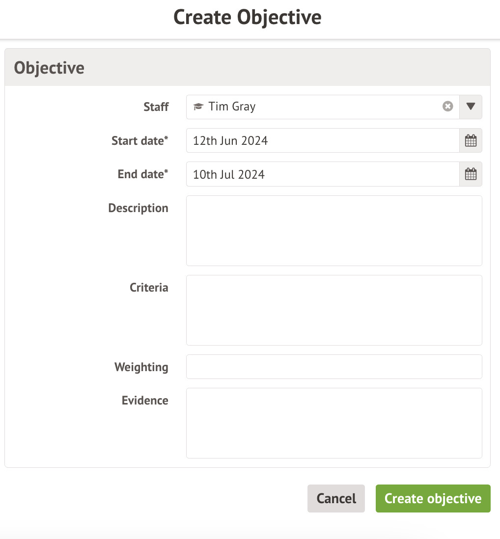 Fill in the slide over with the start and end dates of when the objective should be achieved by, and supporting information if required for records. Once done, click Create objective.