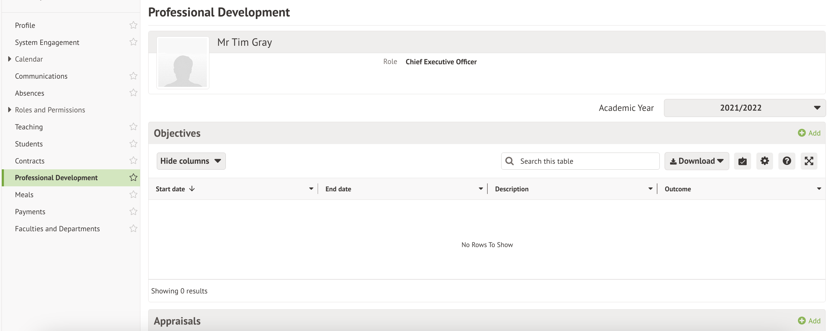 Navigate to a staff profile, and click Professional Development from the left-hand menu. Click +Add to add an Appraisal using the same slide over as shown in the section above.